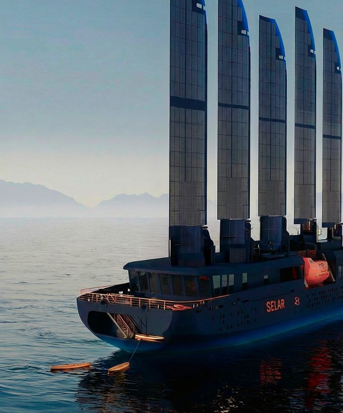 - Solar panels integrated into the superstructure, supporting hybrid-electric propulsion